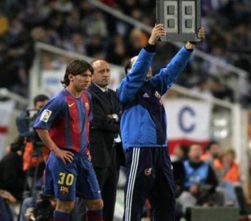 2004年10月16日,在西甲第7轮巴萨对阵西班牙人的加泰罗尼亚德比中,梅西在第82分钟替补出场,换下了德科,这是他首次代表一线队参加正式比赛。