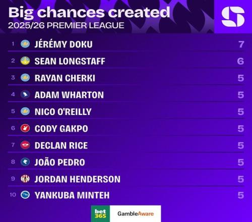 赛季至今英超创造绝佳机会榜:多库7次第1,加克波、赖斯上榜