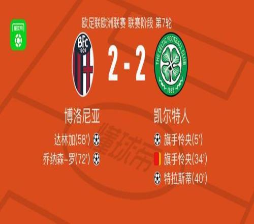北京时间1月23日,欧足联欧洲联赛联赛阶段第七轮,博洛尼亚与凯尔特人战成2比2平局。比赛开始后,前田大然送出助攻,旗手怜央率先破门;随后旗手怜央领到第二张黄牌被罚离场。恩格斯送出助攻,特拉斯蒂破门扩大比分。延斯-厄德高送出助攻,达林加扳回一球。乔纳森-罗攻入一球,将比分追平。