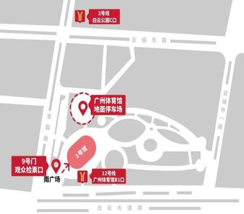 广州地铁2号线:从白云公园站下车,C出口出站后往东前行300米即到达场馆;