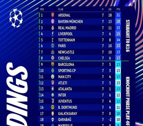 北京时间1月29日,欧冠联赛阶段最后一轮18场比赛全部结束了上半场的争夺。上半场结束后,曼城进入前八名,切尔西掉出前八名。西甲双雄皇马、巴萨目前都暂时落后,分别掉至第5和第13