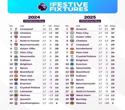 北京时间12月25日,德转列出了2024年和2025年圣诞节当天的英超积分榜,巧合的是,利物浦和阿森纳以相同的积分以及净胜球分别排名第一。与上赛季同期相比,阿森纳(+6分)、曼城(+10分