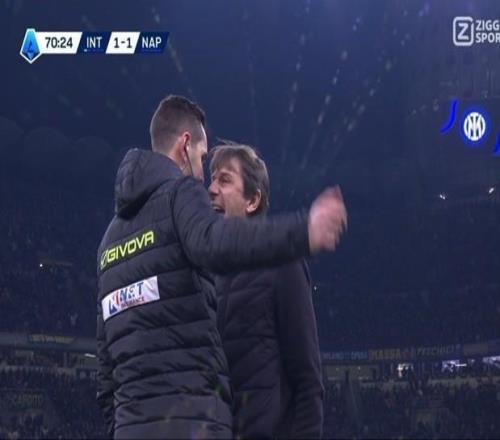 意甲第20轮一场焦点战,国际米兰主场2-2与那不勒斯握手言和。但下半场裁判判给国米的一粒点球引起了那不勒斯主帅孔蒂的强烈不满,他对裁判出言不逊被红牌逐出场外。比赛进行到
