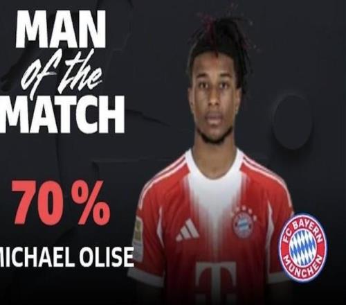 德甲第16轮,拜仁慕尼黑主场8-1大胜沃尔夫斯堡,此役贡献两球一助的拜仁边锋奥利塞当选德甲官方全场最佳球员。此役主场对阵沃尔夫斯堡,首发出战的奥利塞迎来德甲生涯第50场比赛